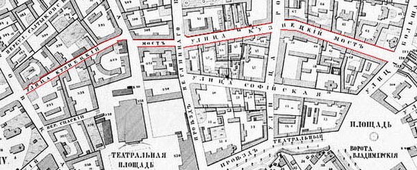 На планах XVIII века ведущая к мосту улица обозначалась как Кузнецкая, а между ней и Софийкой существовал тогда небольшой «проезжий переулок». Постепенно, сначала в обиходе, а затем и официально, улица получила название Кузнецкий Мост и вместе с другими улицами и переулками стала частью сформировавшегося вокруг Кремля полукольца [11] . Отрезок от Кузнецкого моста (угла с Петровкой) и выше в сторону Большой Дмитровки именовался Кузнецким переулком. Некоторое время частью Кузнецкого переулка считался современный Камергерский переулок [12] .